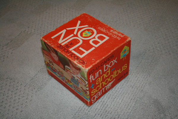 You spin a spinner which as numbers to add and subtract and you move buses around to different buildings collecting apple tokens when you finish at the schoolhouse. When there are no more apple tokens, the game is over. The buildings and buses themselves are tiles themselves. This is a part of the Schoolhouse in a Fun Box series be Ed-U-Cards. Quite clever use of a roll & move mechanic to teach simple addsition and subtraction.