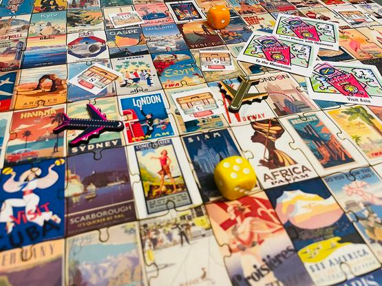 The Destinations edition is a puzzle of vintage travel posters. After assembly, the puzzle becomes a board game where players fly airplanes to various locations to collect lost luggage.