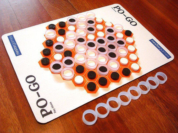 In PO-GO (which stands for Polarity-Go) 2 players alternate turns placing two of their discs of opposite polarity on the board, the goal being to have the largest contiguous group of adjacent discs in either polarity.