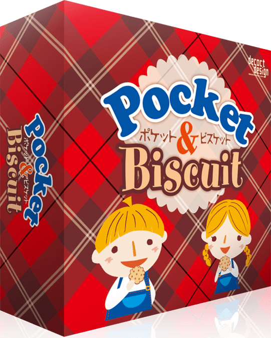 Pocket and Biscuit is a game of collecting delicious cookies. Tiles are laid face down (pocket showing) in a 6x6 grid, and players must find the cookies they want to eat. If you start by finding a single cookie, then two, then even three or more, your cookies can add up, but you always have to put something back in your pocket for later.