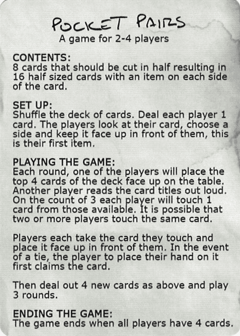 Pocket Pairs is a fast-paced game about finding the commonalities among a card collection. A 9-card game where you must cut the cards into 18 1/2-size cards.