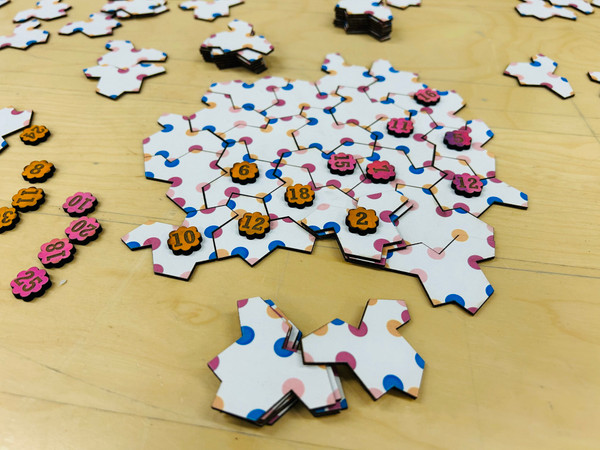 PolyDots is an abstract strategy game and brainteaser for 1-4 players, aged 5+. Using 13-sided tiles called polykites, players align and connect tiles to claim territory with coins matching simple math outcomes.