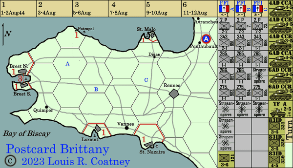 Postcard Brittany is a relatively fast and simple - NO "Zones of Control!" - but historical little 6-turn sudden-death postcard wargame about General George Patton's August 1944 coup de main attempts to grab the major French ports of Brittany, before the Germans could organize their defenses.