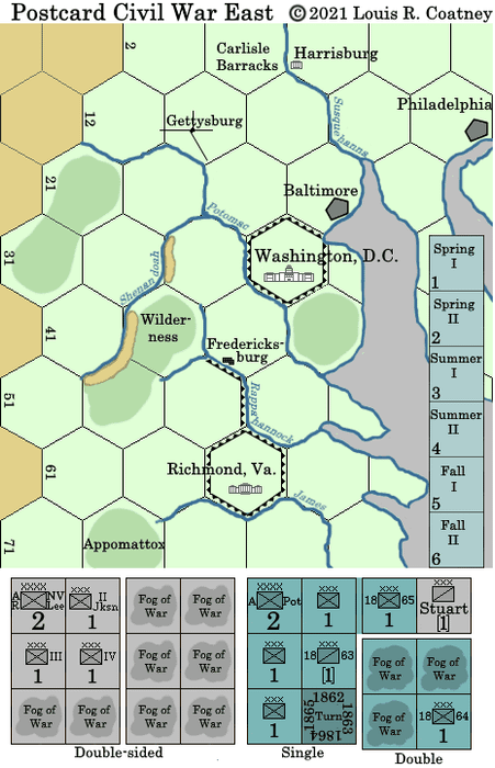 Postcard Civil War East is a little postcard size/format Strategic level board-wargame about the American Civil War in the East to mail/give to family & friends.