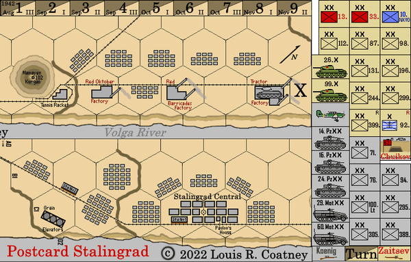 "Postcard Stalingrad" is a relatively fast and simple but historical 9-turn wargame about the 23Aug42-19Nov42 Battle for Stalingrad city.