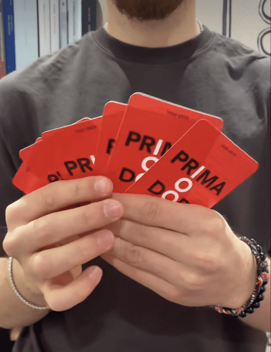 A party game for 2-6 players. A player read an event and the others have to guess the year it happened. If they do not, they get a "before" or "after" answer and they can try again, getting nearer and nearer until they guess. A celebration for the centenary of Istituto della Enciclopedia Treccani: an agile promotional edition will be followed by a richer commercial one and by an online version of the game.