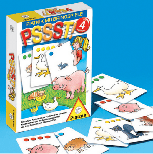 Game play: The starting player plays a baby animal, then the other players may either say “psst, baby is asleep” and start a new deck with a baby card, or place a card onto the first deck, the mother on the baby card, the father on the mother card, and the grandmother on the father card. When the grandmother card is placed the player makes the corresponding animal noise and takes the complete family. A player who cannot place a card must draw an additional card.
