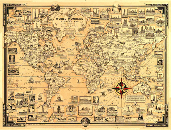 This game uses the 1939 World Wonders map produced by Ernest Dudley Chase. It is a highly detailed pictorial representation of known historical and geographical facts at the time.