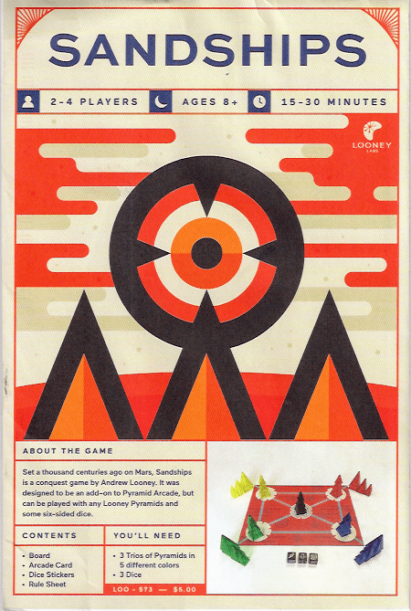 Set a thousand centuries ago on Mars, Sandships is a conquest game by Andrew Looney. It was designed to be an add-on to Pyramid Arcade, but can be played with any Looney Pyramids and some six-sided dice.