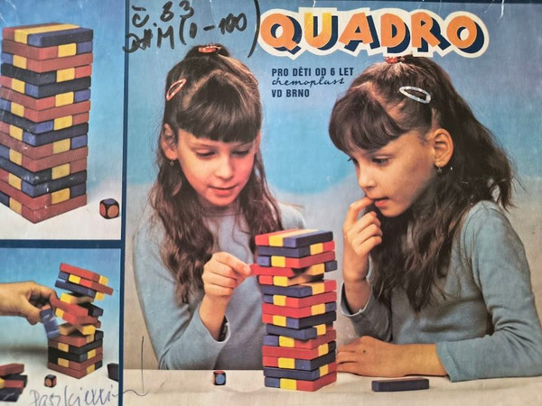 Quadro is a tower-building game played with 45 plastic blocks in three different colors and dice with colored circles that match the colors of the blocks. The blocks are stacked in a tower formation. Each story consists of three blocks of different colors placed adjacent to each other along its long side, and each story is placed perpendicular to the previous (so, for example, if the blocks in the first story point north-south, the second story blocks will point east-west).