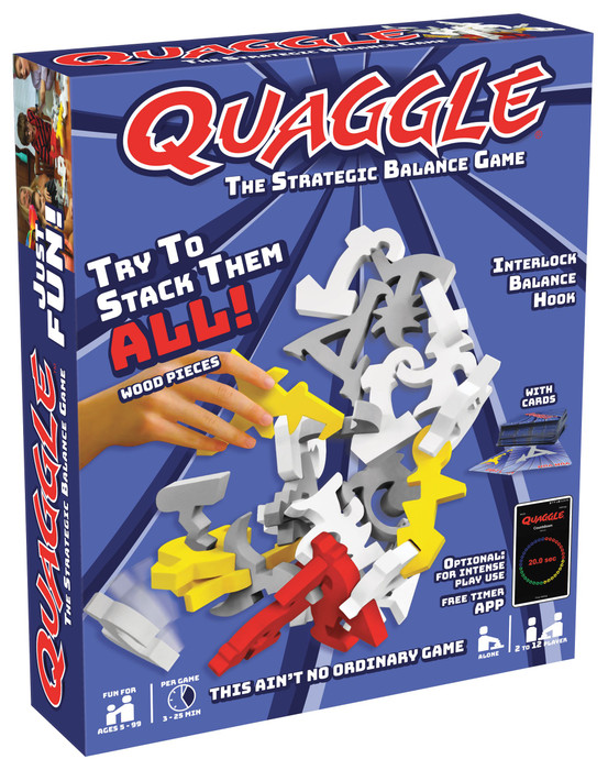 Quaggle is an exciting, fast paced and extremely addictive balancing game. Place, interlock or hook your piece and stack your way to the top. One wrong move could send the structure tumbling. Made of solid wood.