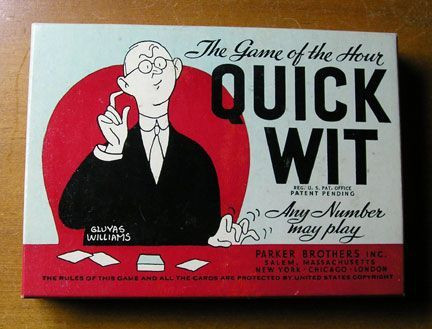 A pack of 52 cards bearing all letters of the alphabet (except X and Z) in the center and classifying words at the top and bottom is used to test the quickness of each player's wit. A classification is read from one card and a letter is then quickly exposed on another. The first player to call a word in that classification beginning with that letter wins a card. When the pack is all used the player having the most captured cards Wins the Game.