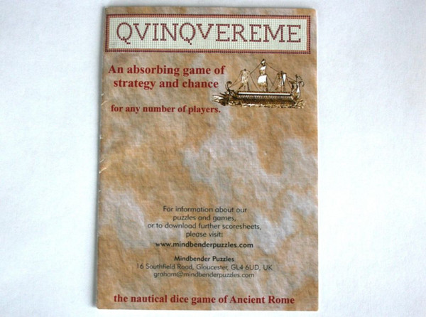 Quinquereme is a light dice game loosely connected to the navies of ancient Rome. Each player has to complete twelve scoring categories in any order, e.g. three of a kind for numbers 1 to 6, four of a kind or a straight of consecutive numbers. Dice may be rolled up to three times per turn. Scoring may vary, dependent on how many throws a player has already used during his/her turn.
