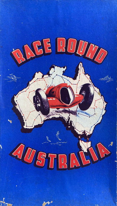 Simple roll-and-move race board game played on a map of Australia. Players race from Adelaide to Darwin, with various penalties, bonuses and detours along the route. Line illustrations of animals, birds and Aboriginal artifacts within the map are keyed to a list of their names in the top left corner.