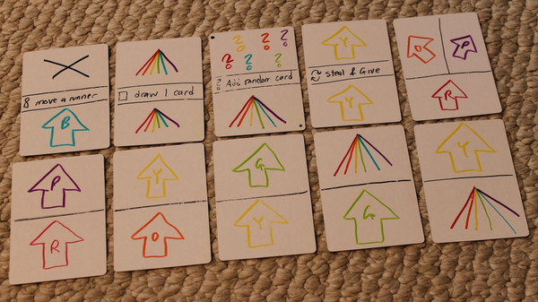 Players attempt to empty their hands by extending the paths of an erupting volcano. Every card has to match the prior color, but most cards change the color of that path. The paths will branch, change colors, and sometimes be blocked entirely. Furthermore, colored villagers are fleeing from the volcano, and cards can also be played to match their colors. Players play up to 3 cards each turn, so it is important to plan ahead and build ‘combos’ by saving up sets of cards that can chain off of each other.