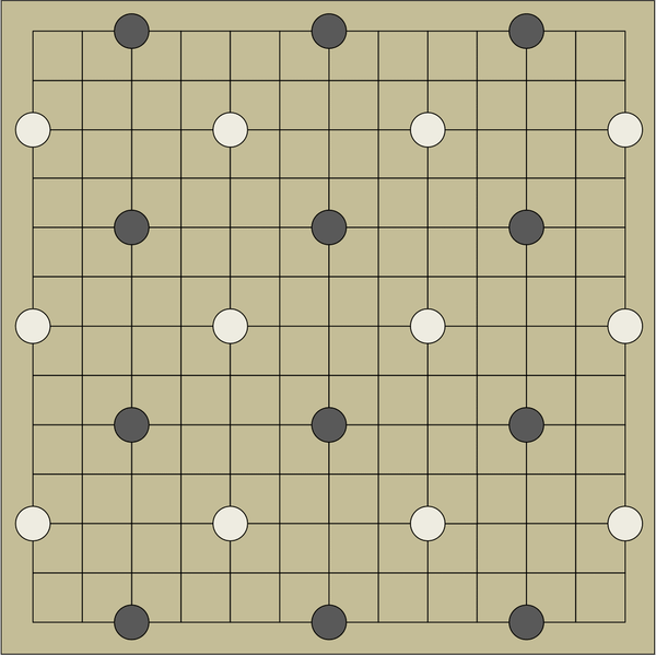 For boards larger than 11x11 only the first criterion applies when determining if a group is dead. You may never remove your own dead groups. If a player has no legal move on his turn he must pass. Passing is otherwise not permitted. The player to remove all opposing groups from the board wins.