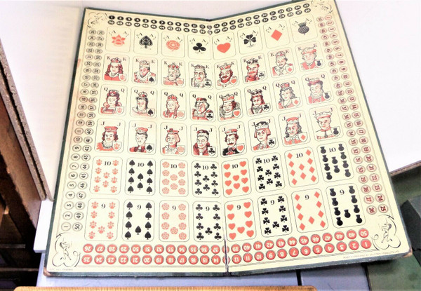 A game played on a board bearing illustrations of 48 black and red playing cards (in a 6 × 8 grid), with Aces, then Kings at the top, down to 9s at the foot. There are numbered circles along each edge of the board, which is green / cream in colour.