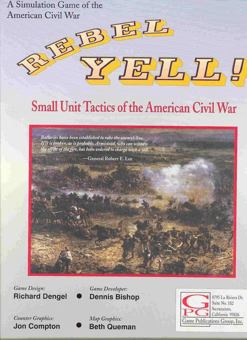 Rebel Yell is a simulation of American Civil War small-unit tactics. The playing pieces in the game represent companies of infantry and cavalry or sections of artillery Each infantry and cavalry unit has one strength point and is equivalent to between 45 and 100 men, depending upon the scenario. Each artillery unit has two strength points and equals two guns. The players of Rebel Yell assume the roles of divisional commanders.