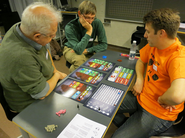 The gameboard consists of three fictive african countries where investements can be placed. Each country has a conflict scale from 1-6 (1-2=peace) (3-4=unrest) (5-6=war). There are nine types of investments and they pay out differently depending on the conflict status of the country. Some of the investments also affect the conflict status in the country where they are located.