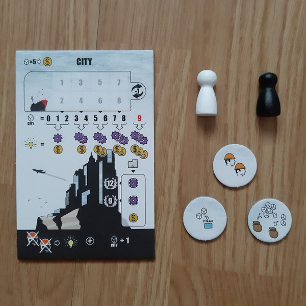 An mini expansion for the 3-player game REFINERY that adds rules for 2 players, a new action tile (the city), and 3 action tokens.