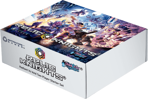 Relic Knights: Radiant vs Void Two Player Starter Set comes with twelve miniatures, unit profile cards, and two Esper decks, providing everything you need to field two 35-point Cadre rosters.