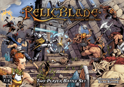 This box contains everything two players need to play Relicblade. including two full size war parties, character cards, upgrade cards, relic cards, measurement gages, tokens, dice quick start guide, and the fully illustrated rulebook.