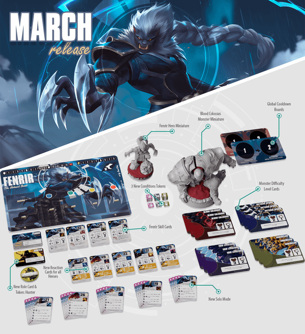 Face a terrifying new challenge with the Blood Colossus, the first monster miniature in Riftlands, and new Monster Difficulty Level cards. This brutal creatures come with new conditions like POISON, CONFUSION, and IMMOBILIZE, demanding new tactical approaches. The March release also enhances gameplay with the new Hunter role cards and token, five new Hero Skill Reaction cards (one for each hero), twenty new Solo Mode cards for increased replayability, and two Global Cooldown Boards for smoother ability tracking. Dive into the March content and unleash new strategies in the ever-evolving world of Riftlands!