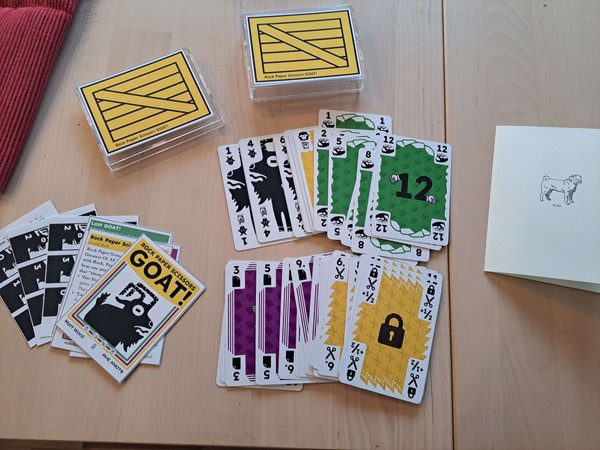 Rock Paper Scissors GOAT! (as in Greatest Of All Time) is a card game with Rock, Paper, Scissor suits that beat one another - and the GOAT suit that “always” wins. Based on the schoolyard classic, you already know some of the rules. Your only choice now is which ruleset to play first.