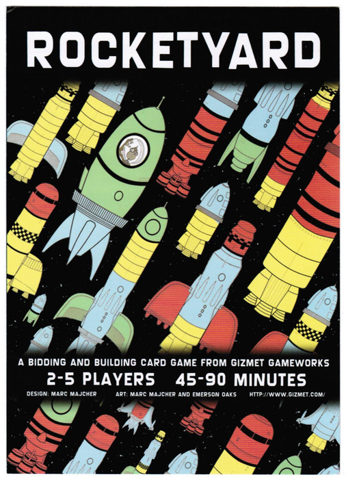 Rocket Yard is a game in which you play developing countries who are bidding for rocketship parts in a grey market junkyard, each trying to be the first one to launch various animals into space safely. The launchiest player wins! Bid for rocketship parts and special helper cards, then when you've got enough, put them together, throw a critter into the capsule, and see if they get off the launch pad!