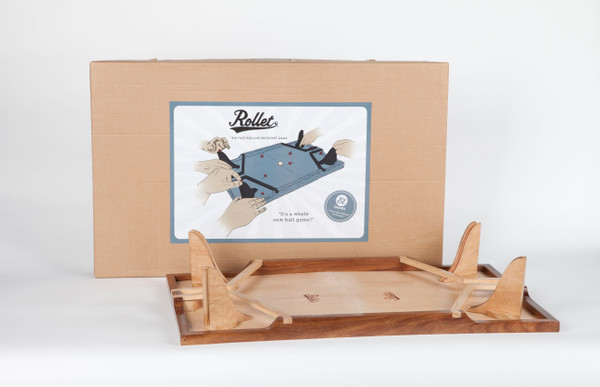 Rollet is a four-player-only fast-rolling ricochet game. The aim of the game is to roll steel balls down your chute in order to knock the wooden ball in the central arena into your opponents' goal. Players compete in teams of two, with each team trying to protect one goal between them.