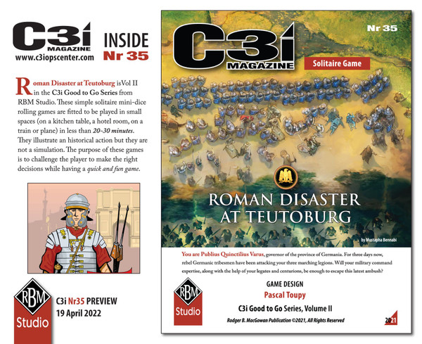 Roman Disaster at Teutoburg is Vol II in the C3i Good to Go Series from RBM Studio. These simple solitaire mini-dice rolling games are fitted to be played in small spaces (on a kitchen table, a hotel room, on a train or plane) in less than 20 to 30 minutes. They illustrate an historical action but they are not a simulation. The purpose of these games is to challenge the player to make the right decisions while having a quick and fun game.