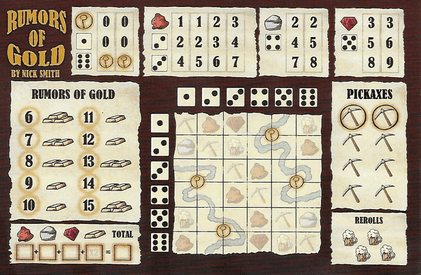 Rumors of Gold is a solo roll & write game set in the California gold rush of 1848. The player aims to get rich by digging for the most valuable resources and panning for gold.