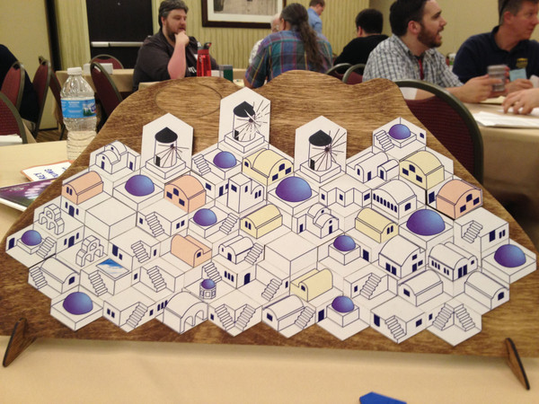 Santorini is a unique 2-player tile-placement game featuring a nearly vertical playing surface. Your goal is to be the first to place all of your hotels so that their views are captivating. Players take turns placing interlocking hexagonal tiles on the inclined board, stacking upwards from the shoreline at the bottom. Each tile shows an isometric view of a portion of the village.