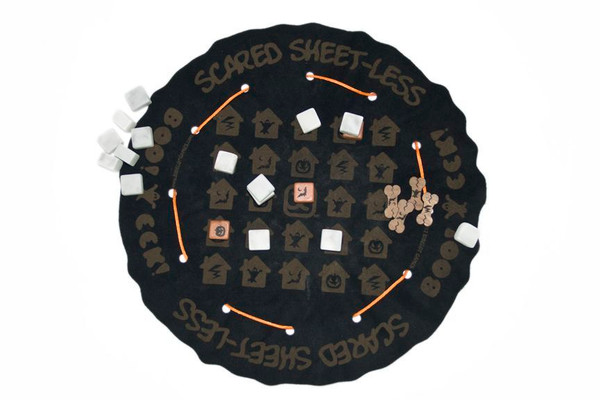 In Scared Sheetless, scaring is the name of the game! But let's face it, there's nothing scary about a naked ghost. The game starts out with you and your ghostly competitors alone in the new neighborhood, a neighborhood only big enough for one ghost. On your turn, roll your bones. Doubles reveal new sheets and the rest of your roll is movement. Match the symbols to move from house to house, picking up sheets and scaring your fellow ghosts as you go!