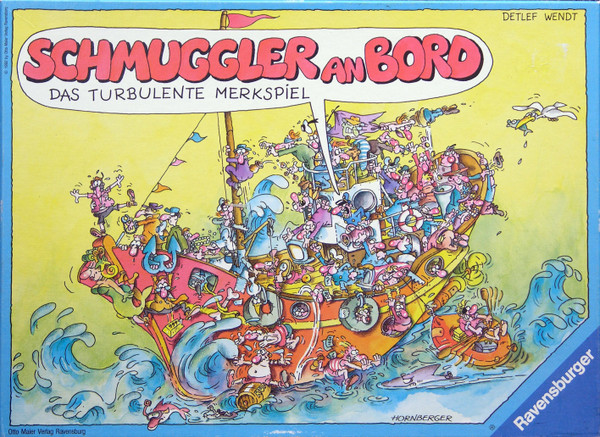 The game consists of a board, showing 30 different types of contraband goods, Gold, Cigarettes etc, each marked by a small picture and it's name. Each picture has a matching tile, which is placed face down over it. Players each receive a number of chips and then take two or three (depending on the number of players), of the tiles for themselves, announcing which they have taken and then laying them face down in front of them. Now play begins.