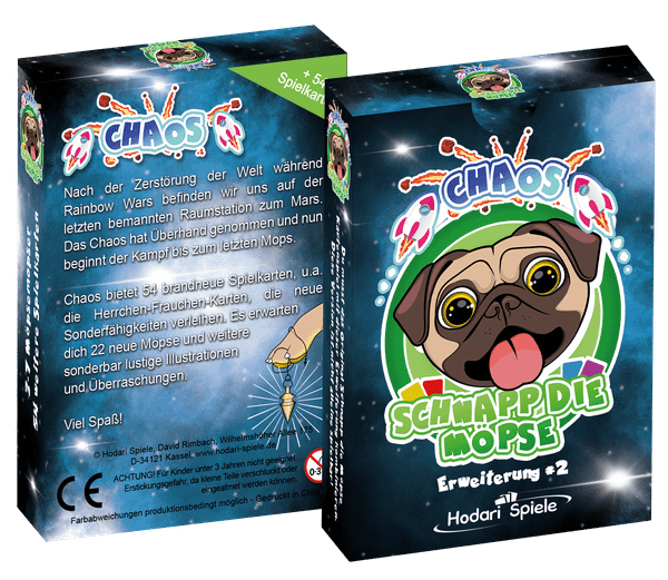 Chaos is the second expansion for Schnapp die Möpse the card game and consists of 54 Game Cards of which every card is beautifully illustrated.