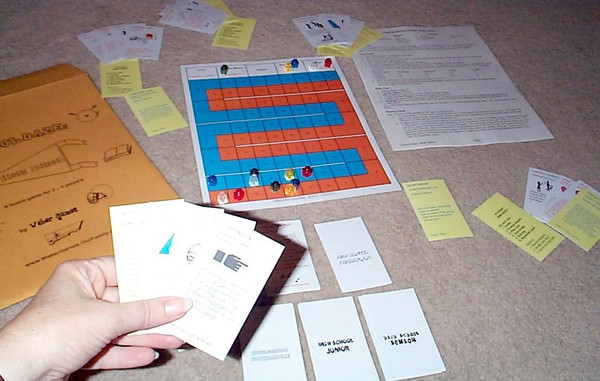 A simple family game about the challenges of keeping up your grades while trying to become popular. Use your crib sheet to remember what to do each turn: