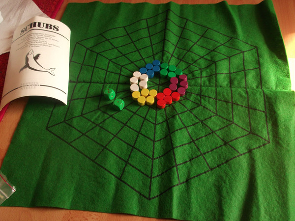 There are five circular "lanes" on which five pawns of each player move onward. The goal of the game is to align all five pawns in a straight line. However, each time a pawn lands on a field with another pawn, that other pawn is pushed (German: geschubst) onward one field.