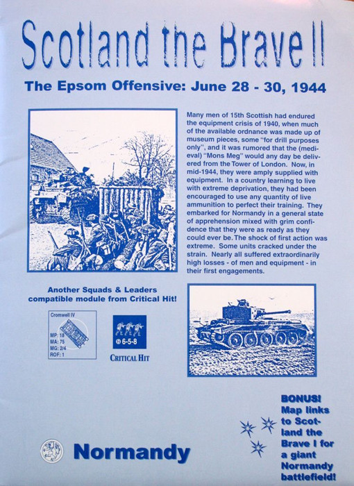 SCOTLAND THE BRAVE II includes a well-researched historical game map of the battlefield, special rules, ten new scenarios and two Platoon Leader 2.x campaign games. As a special bonus, CG 3 links the maps from StB I with StB II for a giant Normandy battlefield You will also receive a designer's notes booklet. Everything is included to play using your existing rulebook and game pieces.