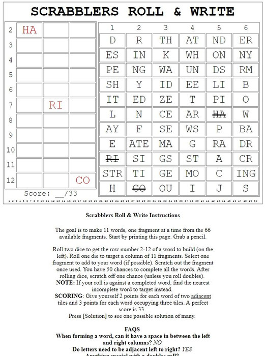 In this PnP, R&W version of the Scrabblers game, you meld 1-, 2- and 3-letter fragments into words. Roll dice to randomly select positions and fragments. You have 50 chances to make 11 words from 66 available fragments.