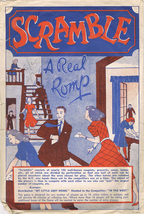 Hundreds of slips are provided, each one being a match for another one. Each guest will receive a slip from the host and told if it is from a famous couplet, proverb, song or hymn. The other slips are piled on a suitable table. On the word "Go", the guests (all at the same time) must sort through the table slips until they find the match. If correct, they are given another slip and must go back to find that slip's match. The guest who pairs up the most slips in a given time will win.