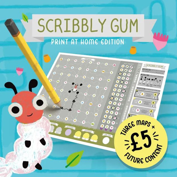 In Scribbly Gum: Print at Home Edition, each player has their own tree diagram and every turn gets to draw a line that leads to food for your baby moth to eat. Collect sets of food to score points. Whoever scribbles their way to the most valuable food wins!