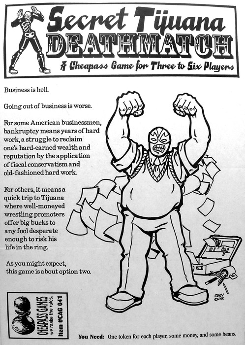 In Secret Tijuana Deathmatch, it is your job as wrestling promoter to go to the United States, hire five of the best (or most desperate) businessmen and then pit them against your opponents' wrestlers in fights to the death.