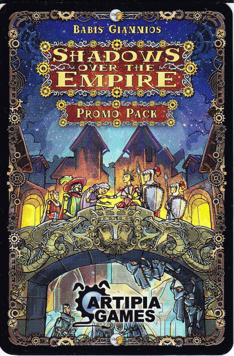 The Shadows over the Empire: Promo Pack includes three new Distinct Personalities with unique abilities — Priscilla: Mother of the Empire, Azarias the Conspirator, and Aribar the Loremaster — as well as twelve new level C cards that can be used with Shadows over the Empire. This mini-expansion also includes a player's aid that explains how some of the new cards change the rules.