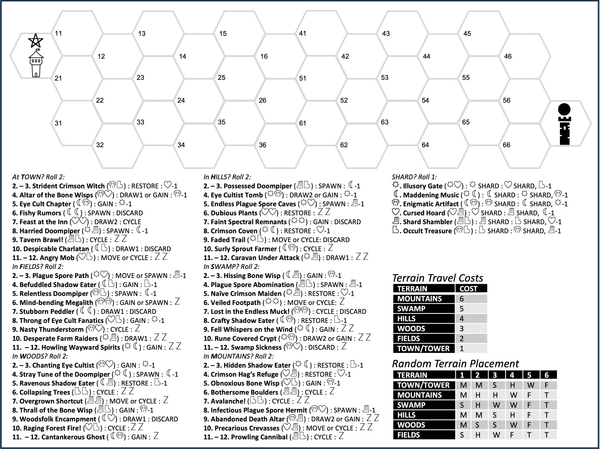 This is a board game for 1 player. You control a shard harvester, seeking the power to create spells. Travel can be challenging and tiring. Encounters can be deadly and devastating. Your spells will help you survive the perilous wild. You might die from wounds or succumb to old age. If you have one or more shards collected and you reach either of the towers (the Star Tower or the Night Tower) you win the game, and your shard harvester may either retire or resume the harvest in future games. It may take several journeys for a single shard harvester to achieve the maximum victory.