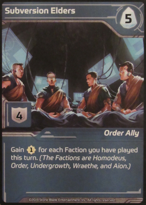 Subversion Elders is a promo card originally available as part of the 2020 Man vs Meeple Season 3 Kickstarter campaign.
