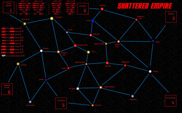 Shattered Empire is a Print and Play (PnP) solo game in which the player takes on the struggles of the people of Earth to rebuild and defend their new star empire. The map depicts the systems around Old Terra and, beyond that, the regions controlled by other governments and races. Each turn represents about a decade of time and each ship counter is an individual starship. Players try to expand and defend their empire and score victory points over a 150 year period of time (less if your empire completely succumbs to its foes).