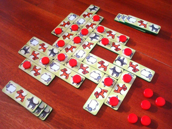 Sheep, Dogs and Wolves, invented by Néstor Romeral Andrés and his daugther Elena (at age 4), is a tile-laying game for two players (sheep and wolf) who share a common pool of rectangular pieces depicting a sheep, a dog and a wolf, in that order. The sheep player must save as many sheep as possible, while the wolf must feast on those sheep. Chomp!