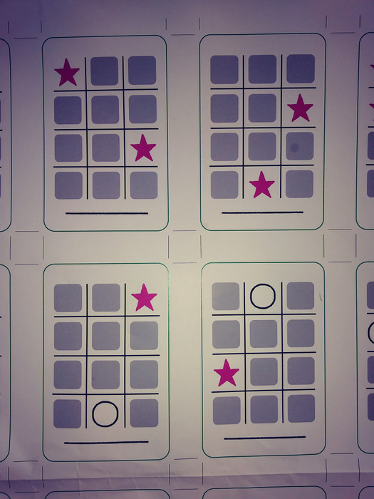 On each player's turn they select a card from the three face up ones and add it to their hand, and after doing so add a counter or counters to their playmat, according to whether they have a pink star in that location on the card they've picked up. If they have stars in multiple locations on the card, they add a counter to each of those locations on their playmat, whether or not they have a counter there already from a previous turn, and regardless of whether or not there is a nought or a cross in that location on another card.