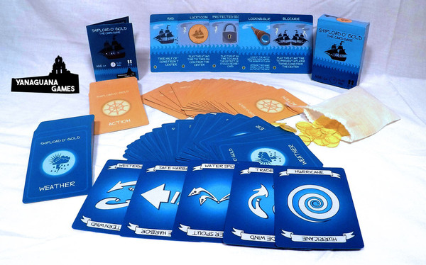 Shipload o' Gold is a pirate themed heavy interaction coin management game. The entire point of the game is to be the last pirate with coins, a condition that wins the game as soon as it occurs. There are two decks, the "action deck" which contains cards players can use to their benefit or their opponenets demise. The second "weather deck" is working against everyone collectively to move coins, take coins, and force players to discard cards randomly.